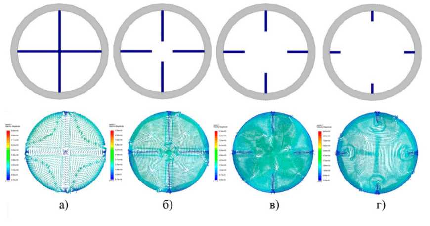 Fig. 4. Geometry of straightener and velocity fields in a typical section for: а – cross-shaped insert; б – straight ribs 13.5 mm; в – straight ribs 9 mm; г – straight ribs 4.5 mm
