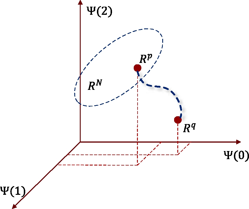При изменении сигнала напряжения относительно нормальных, заданных в области RN, АКФ также будет меняться. Предположим что сигнал напряжения в момент времени p представлен точкой Rp в области нормальных вариантов АКФ RN. Тогда при изменении сигнала напряжения АКФ в другой момент времени q>p будет представлена точкой Rq на рис. 1. Другими словами, изменения вектора автокорреляционной функции напряжения отражают пространственно-временную эволюцию динамических характеристик напряжения, что имеет большое значение для понимания и прогнозирования нарушений напряжения. Выявленный в векторном пространстве АКФ дрейф RpRq за пределы области RN нормального динамического поведения системы означает, что в момент времени q обнаружено нарушений напряжения.