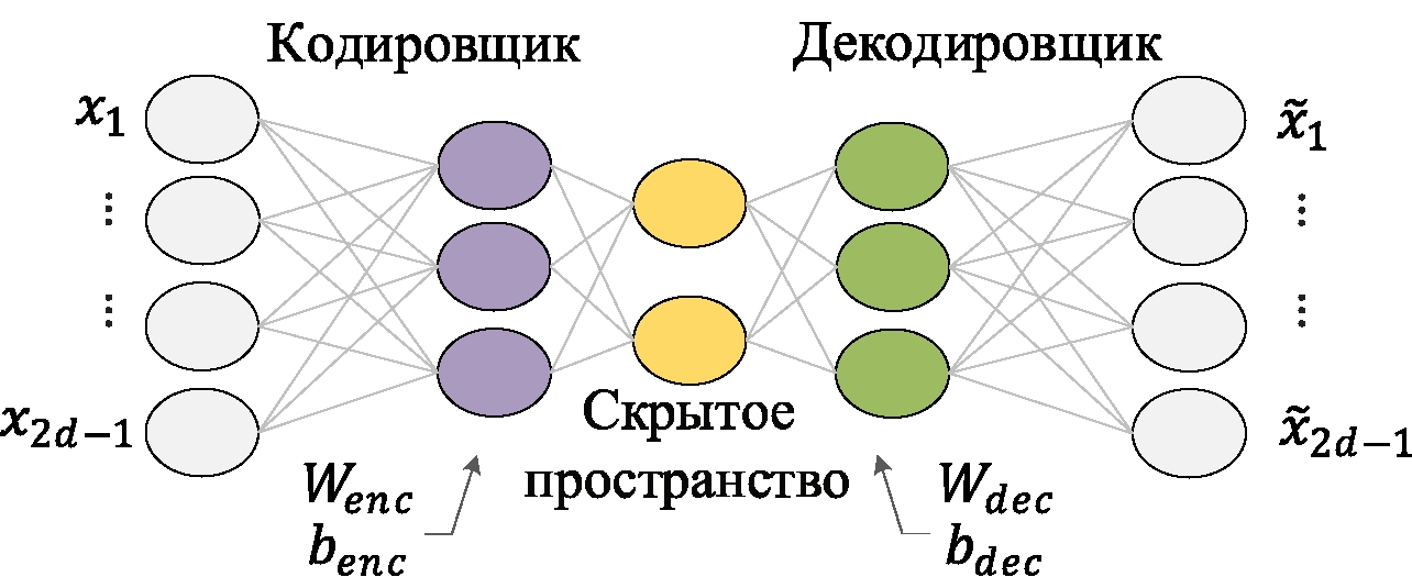 Автокодировщик состоит из двух частей (рис. 2): кодировщика и декодировщика. Кодировщик отвечает за сжатие входа в скрытое пространство и представлен функцией кодирования z = fWencx+benc. Декодирировщик предназначен для восстановления входа из скрытого пространства и представлен функцией декодирования x~ = fWdecz+bdec. Размерности векторов x и x~ совпадают, размерность вектора z меньше размерности x. Таким образом,