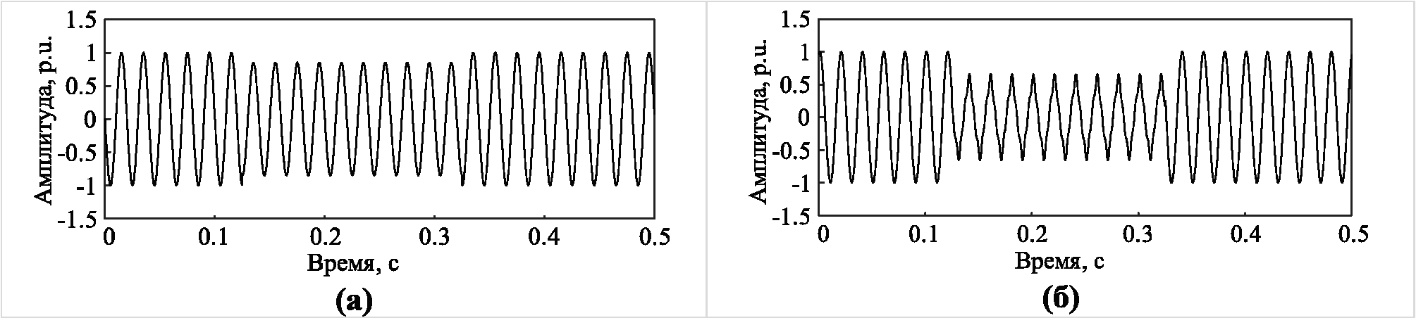 Рис. 10. Результаты обнаружения провала напряжения при наличии шума (а)  и гармоник (б) предложенным методом\