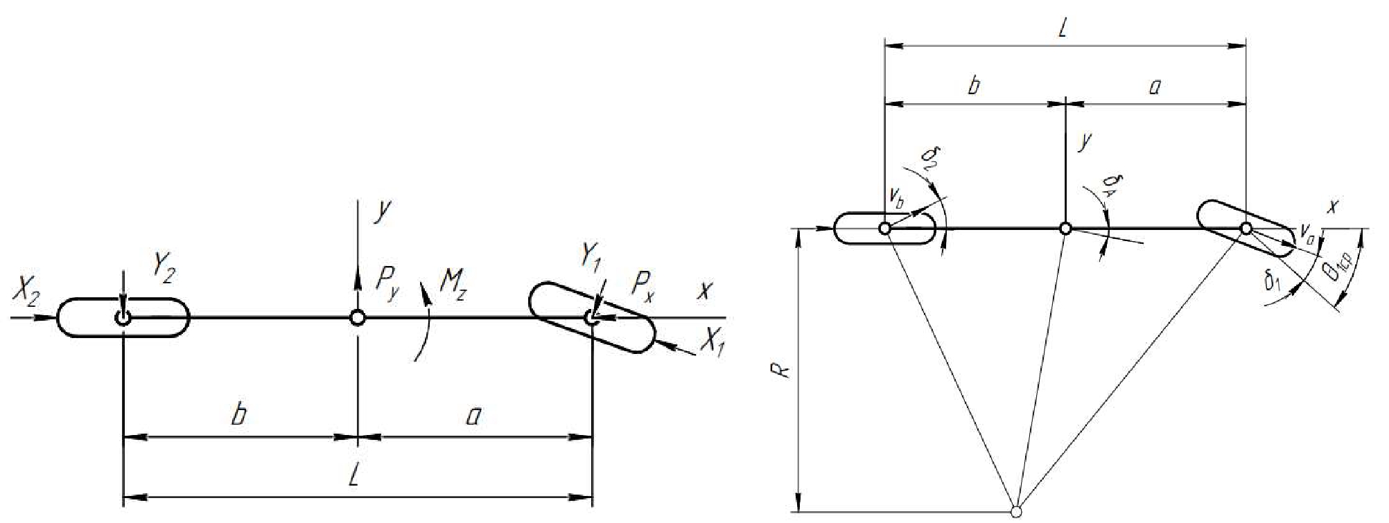 где – скорость движения транспортного средства; L – колесная база; – средний угол поворота передних колес; – средний угол увода передних колес; – средний угол увода задних колес; – суммарный коэффициент сопротивления уводу передних колес; – суммарный коэффициент сопротивления уводу задних колес; g – ускорение свободного падения; Ga – вес транспортного средства; a – расстояние от передней оси до центра тяжести транспортного средства; b – расстояние от задней оси до центра тяжести; Jz – момент инерции транспортного средства вокруг оси Z; ja – боковое ускорение; проекция внешних сил, действующих на транспортное средство; Mz – внешние моменты, действующие на транспортное средство, вокруг оси Z; X1 – тяговая сила на колесе; – скорость поворота управляемых колес.