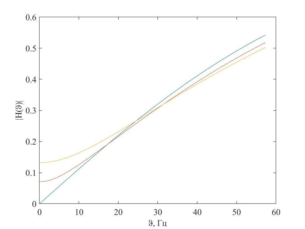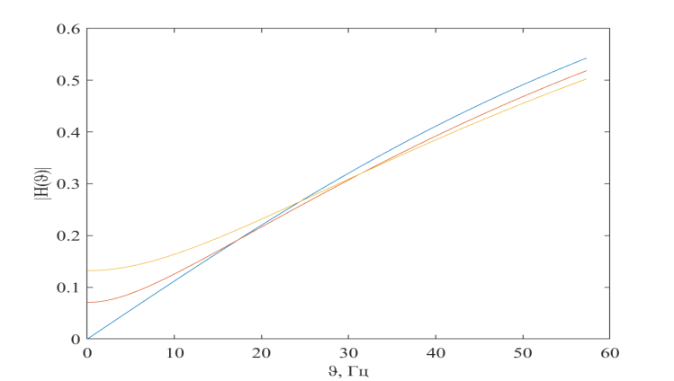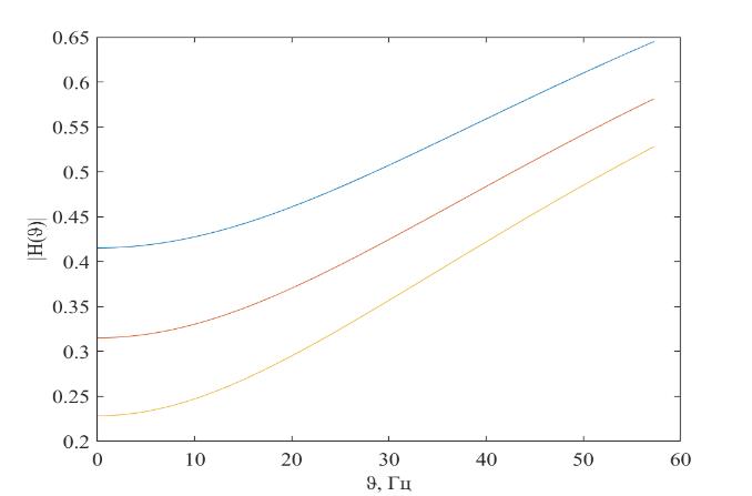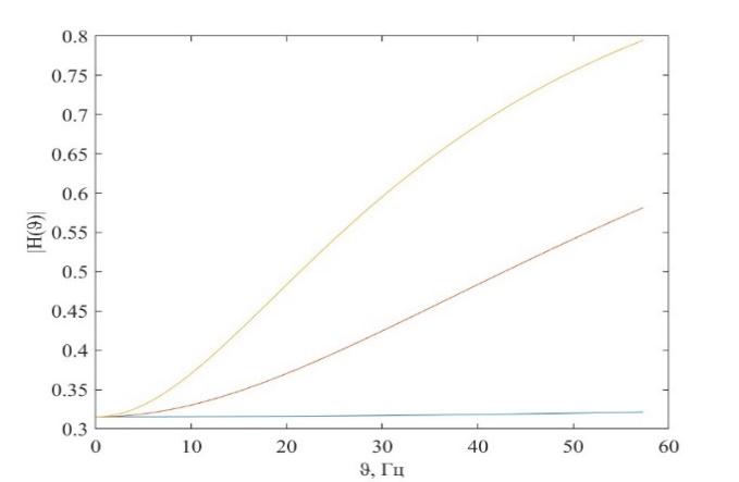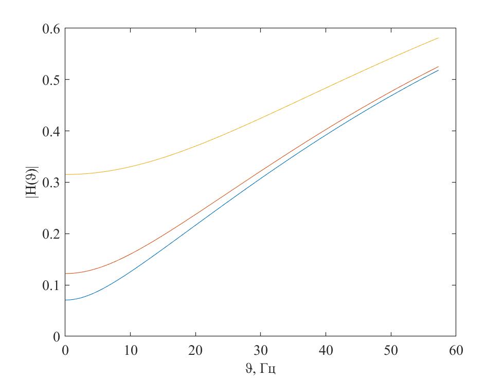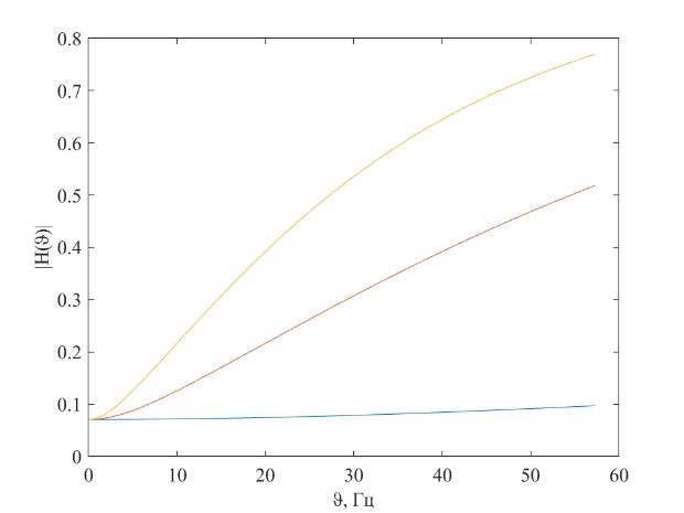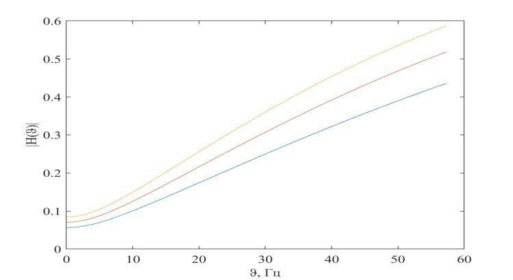 Рис. 3.3. АЧХ для различных масс заднеприводного автомобиля: синий – 12220 кг, красный – 15510 кг, желтый – 18800 кг
