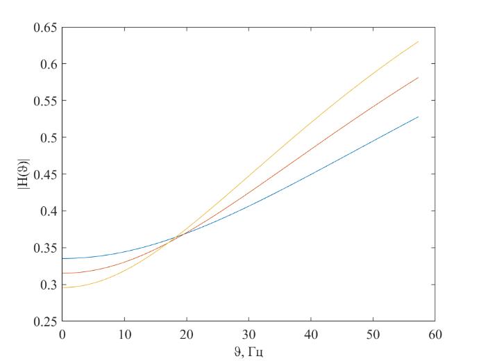 Рис. 2.3. АЧХ для различных масс переднеприводного автомобиля: синий – 12220 кг; красный – 15510 кг; желтый – 18800 кг