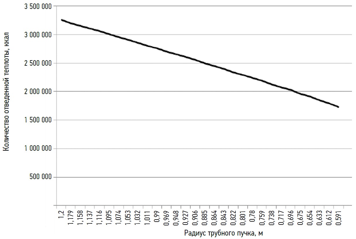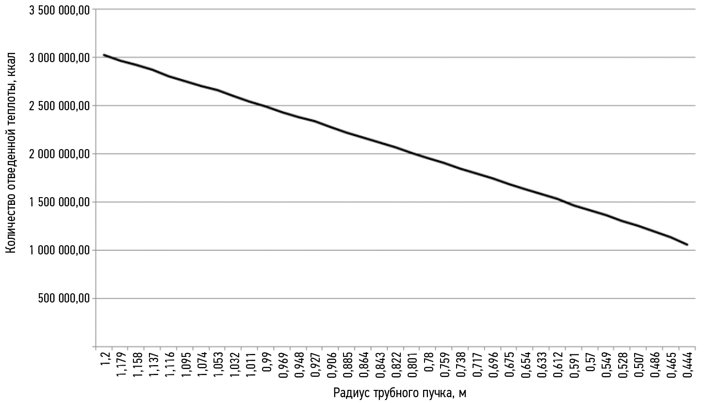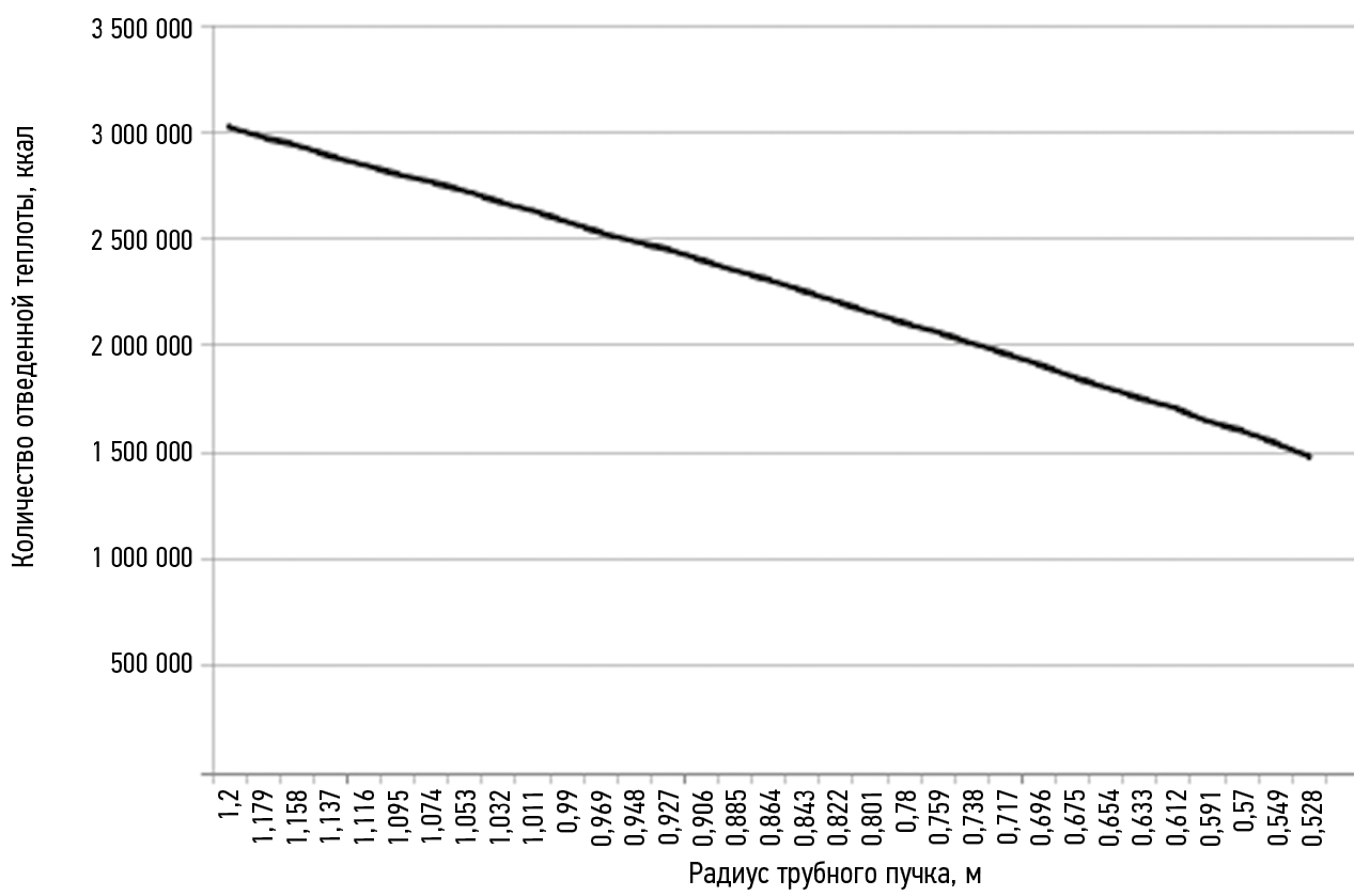 Рис. 8. Количество отведенной теплоты трубного пучка с винтовыми круглыми трубками, ккал.