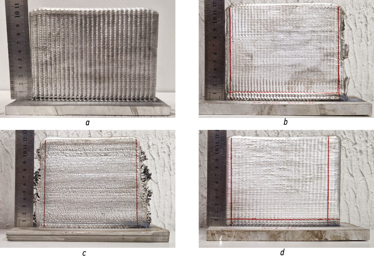 Fig. 3. View of manufactured samples: a, linear oscillations normal to the manufacturing path; b, linear oscillations at a 45 degree angle to the manufacturing path; c, elliptical oscillations along the manufacturing path; d, zigzag.