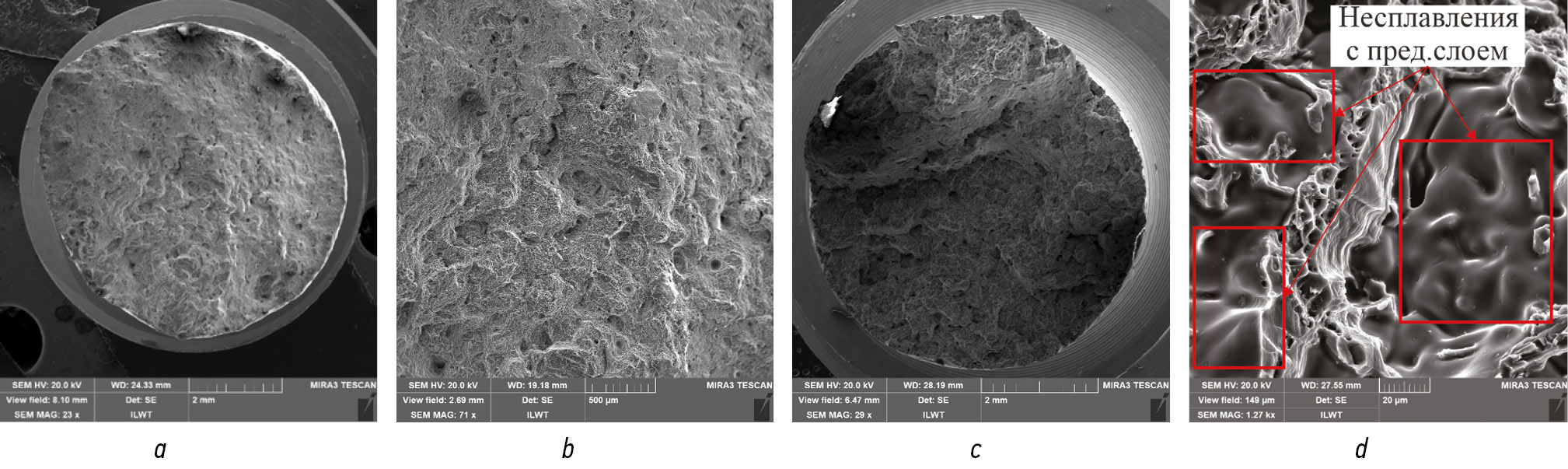 Рис. 9. Внешний вид изломов: a ― общий вид, направление Х; b ― увеличение, направление Х; c ― общий вид, направление Z; d ― область с несплавлениями между слоями, направление Z.