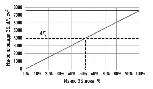 Рис. 2. Изменение добавки к площади сечения ЭБ в зависимости от степени износа дока.