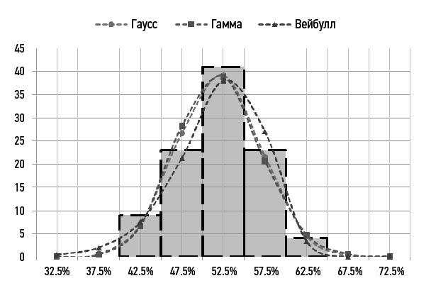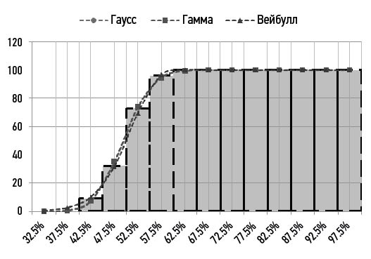 В настоящей работе анализируется соответствие статистического распределения нормальному закону (закон Гаусса), гамма-распределению, распределению Вейбулла. Показано, что эти теоретические распределения приводят практически к одинаковым результатам, поэтому принято решение использовать нормальный закон.
