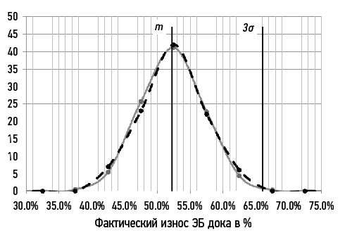 Аппроксимация статистического закона распределения некоторым теоретическим законом позволяет получить оценки нормативного износа дока с заданной обеспеченностью (вероятностью превышения).