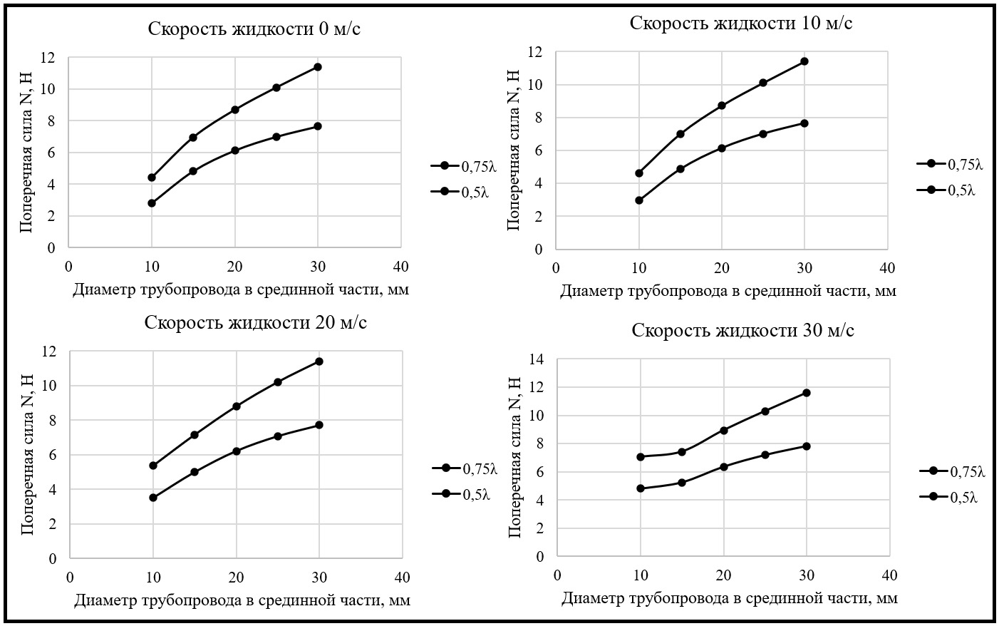 По полученным значениям, представленным в таблицах 10, 11 были построены графики зависимости опорных реакций от диаметра сечения трубопровода в срединной части — 10, 15, 20, 25, 30 мм, при различных скоростях движения жидкости — 0, 10, 20, 30 м/с (рис. 8).