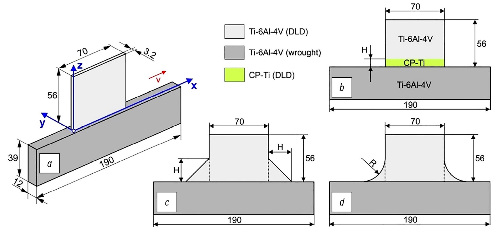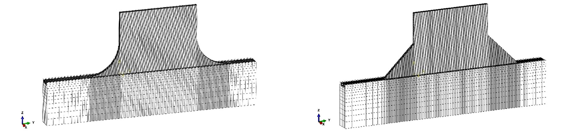 Для минимизации напряжений и деформаций в рассматриваемой наплавке в местах концентрации напряжений на торцах стенки добавлены галтели, как показано на рис. 1, c, d. Анализируются следующие варианты галтелей: плоские галтели с катетом 14 и 28 мм (рис. 1, с); вогнутые галтели с радиусом 14 и 28 мм (рис. 1, d). В качестве альтернативного способа минимизации напряжений предложено выполнять несколько первых слоев, примыкающих к жёсткой подложке, из сплава с меньшими прочностными свойствами, например, из технически чистого титана (CP-Ti Grade 2) (см. рис. 1, b). Рассматривается два варианта протяженности мягкой прослойкой: 5 наплавленных слоев суммарной высотой 2,8 мм и 10 наплавленных слоев суммарной высотой 5,6 мм.