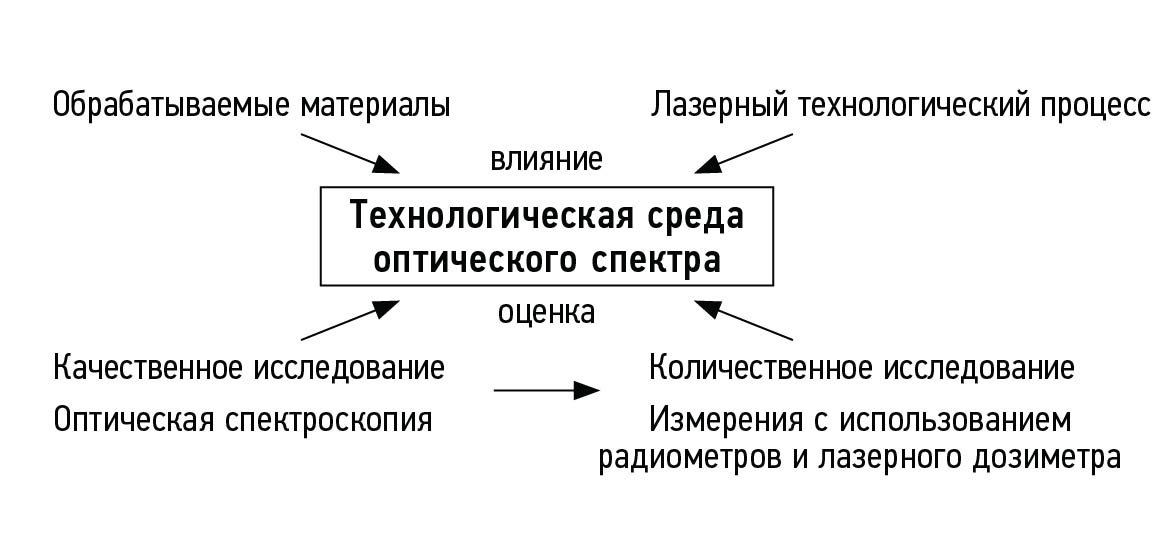 Для того чтобы описать процессы взаимодействия лазерного излучения (ЛИ) с обрабатываемыми материалами, сформулирован термин «технологическая среда оптического спектра» (ТСОС), под которым понимается совокупность таких факторов, как отраженное и рассеянное ЛИ, сопутствующее излучение от пароплазменного факела и обрабатываемого материала, возникающих во время ЛТП, влияющих на протекание процесса и на персонал.