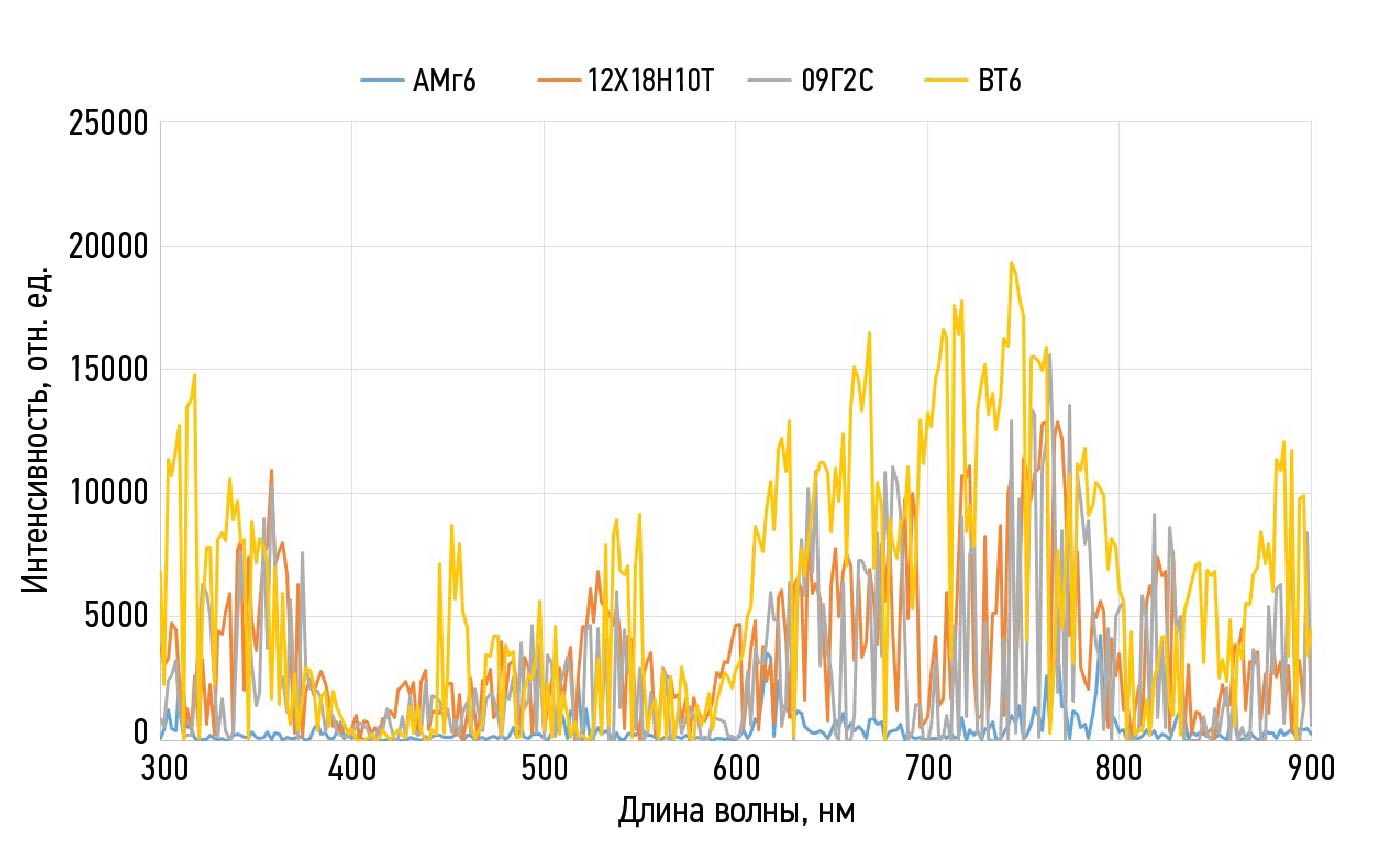 Из рис. 3 видно, что самый интенсивный спектр зафиксирован при обработке титанового сплава ВТ6. Спектры плазмы образцов стали 09Г2С и 12Х18Н10Т по многим линиям совпадают. Спектр плазмы образца алюминиевого сплава АМг6 имеет наименьшую относительную интенсивность по сравнению с остальными. Экспериментально было установлено, что плазма, возникающая от воздействия ЛИ на обрабатываемый материал, создает спектр излучения, образованный многочисленными полосами, которые располагаются в УФ, видимой и ИК-областях спектра. Эти значения характерны для исследованных материалов [5].