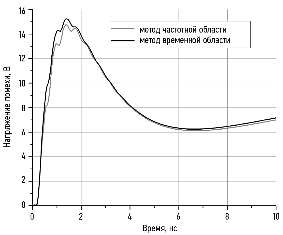 Кроме того, воздействие тока ЭСР можно рассчитать методами частотной области. В этом случае необходимо аппроксимировать стандартную форму тока суммой конечного числа синусоидальных токов различных частот и провести анализ воздействия для каждой из частот, что позволит уменьшить число элементов, на которые разбивается геометрия модели и предоставит дополнительную информацию о связи уровней помех с геометрией блоков аппаратуры. Подобный подход использовался в [8] для моделирования влияния коронного разряда на антенны самолетов.
