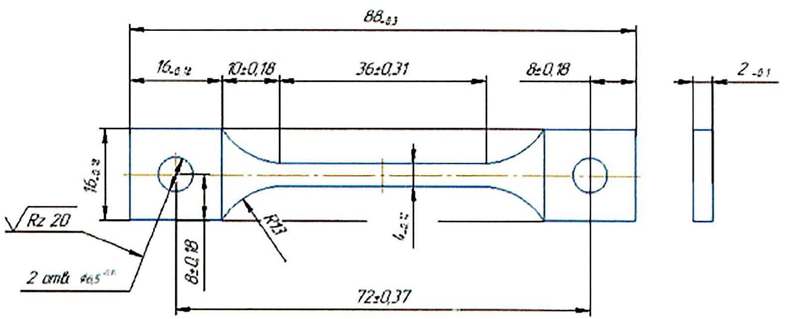 Испытания на растяжение проводили по ГОСТ 1497-2023 при комнатной температуре на образцах толщиной a0 = 2 мм, шириной b0 = 4 мм, с начальной расчетной длиной I0 = 25 мм (рис. 2).