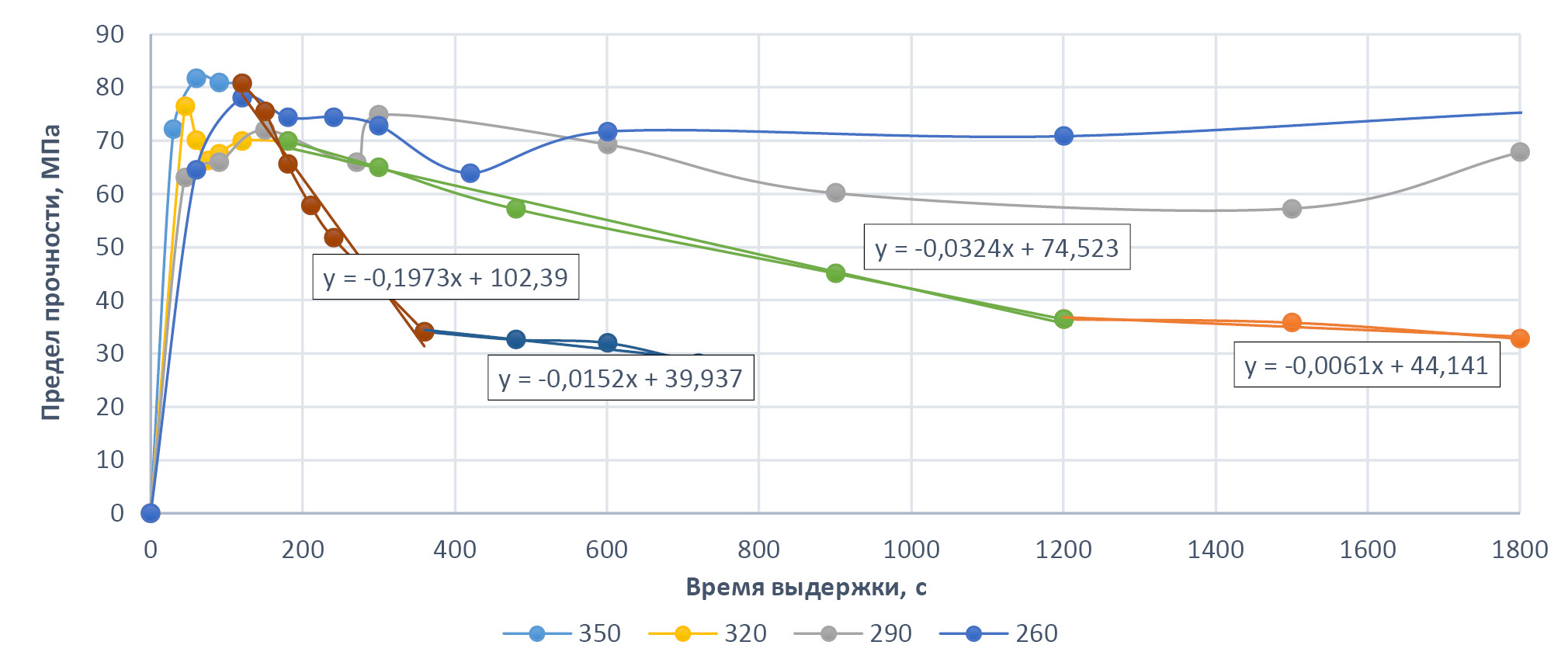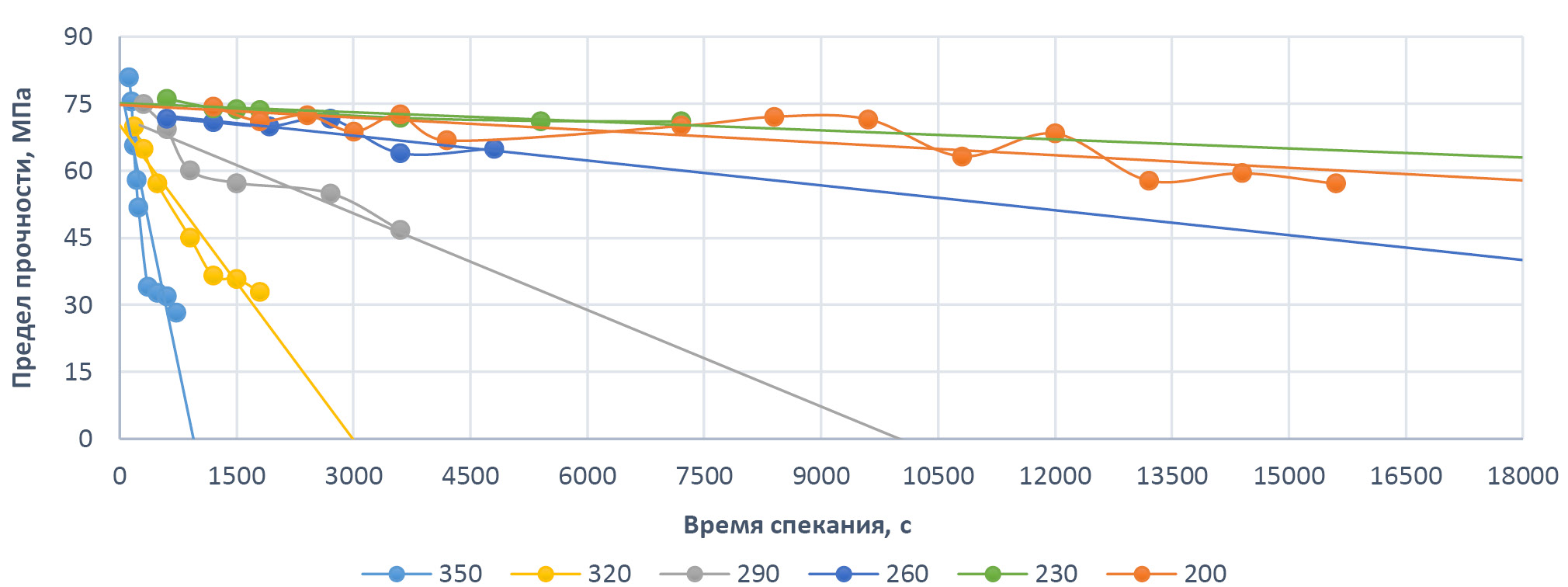 На рис. 6 показаны графики зависимости предела прочности от времени спекания при различных температурах, а также произведена аппроксимация экспериментальных кривых. Первоначально, аппроксимация производилась экспоненциальными контурами тренда, т.е. характер изменения прочности во времени казалось, носил экспоненциальную выраженность, но после проведения уточняющих стадий эксперимента, пришли к мнению, что целесообразнее перейти к линейному характеру.