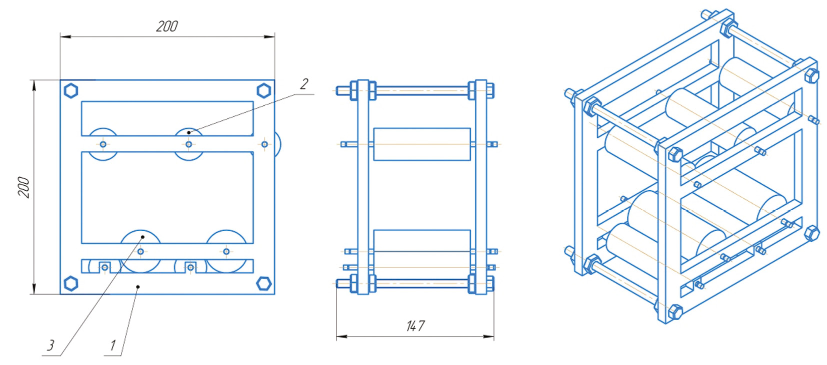 Для работы поливной машины необходимы три основных узла (рис. 1). Несущая рама (1), ее было решено изготовить с помощью аддитивных технологий из пластика «Petg», должен обеспечить достаточную прочность и жесткость всей конструкции. Лонжероны рамы будут стягиваться между собой болтами, металлические элементы в конструкции рамы добавят жесткости. Для валов натяжной системы (2) были взяты ПВХ-трубы, у них достаточная ровность поверхности и их легко интегрировать внутрь рамы без лишней доработки. Поливная система (3) состоит из кювета и набрасывающих эмульсию валиков, к последним требуется особое качество поверхности, потому было принято решение выточить их из алюминия на токарном станке.
