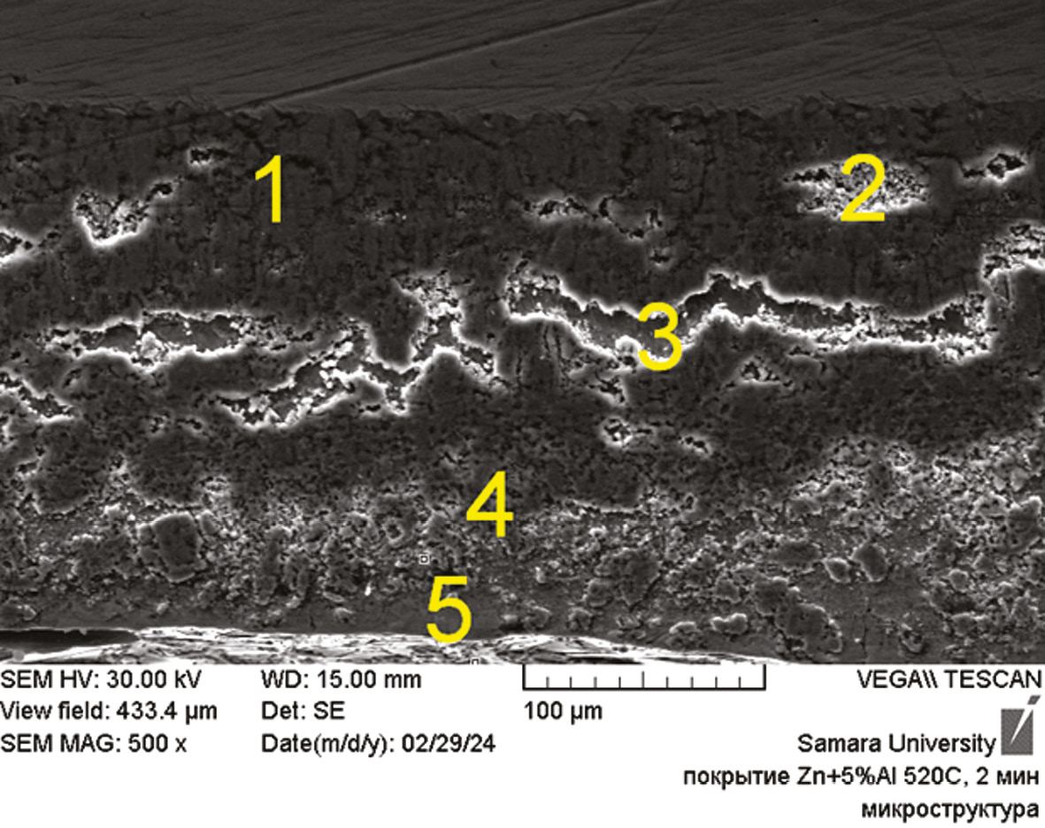 При проведении спектрального анализа можно заметить, что покрытие, полученное при 520 °С, преимущественно состоит из алюминия и железа, нежели из цинка (табл. 1).