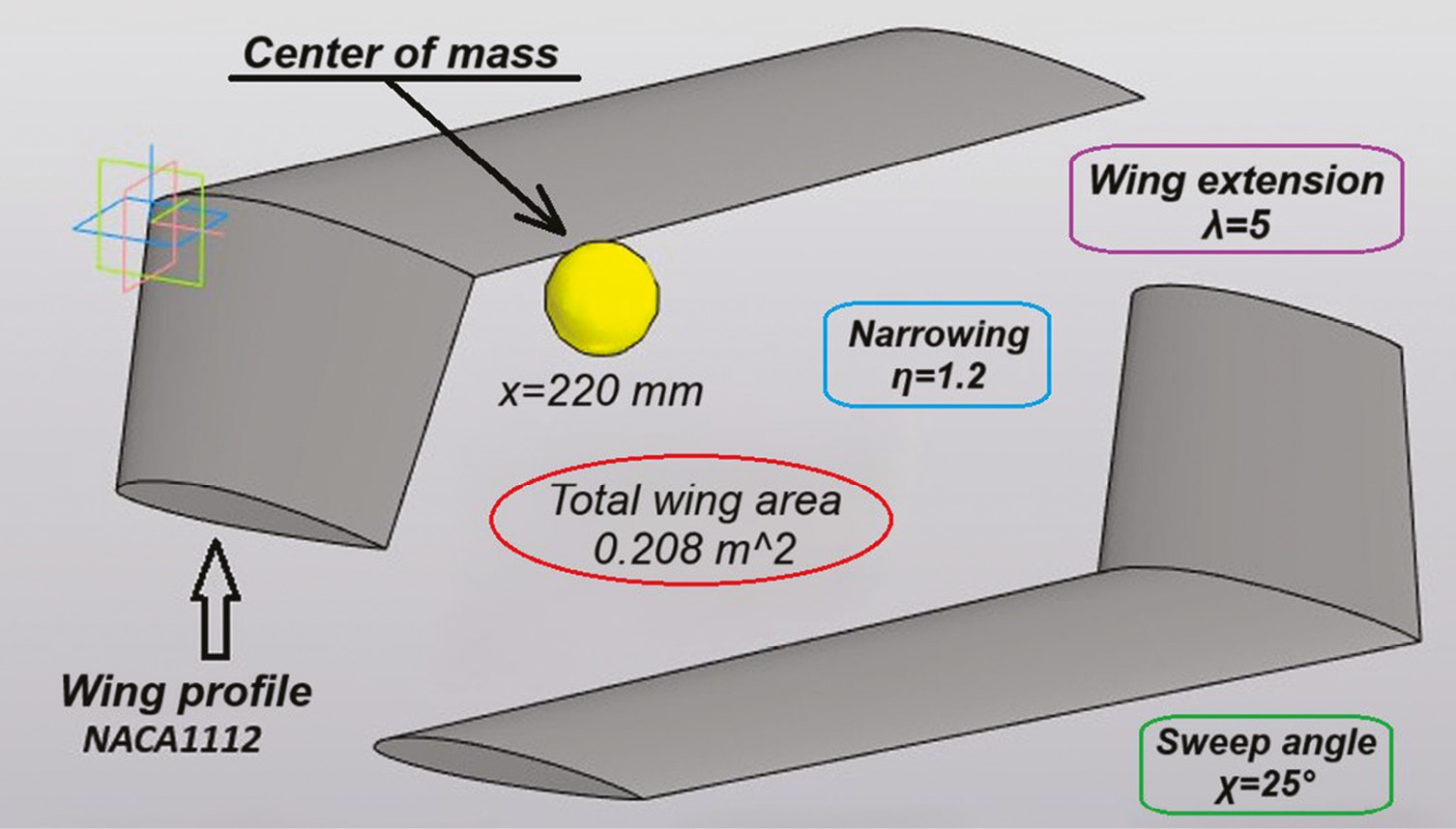 Methods. Optimal geometric characteristics of the wing have been selected. A summary of weights has been made. Pegasus must be balanced with its center of mass 220 mm along the X-axis relative to the origin (Figure 1). NACA-1112 profile was selected. Wingspan is 720 mm.