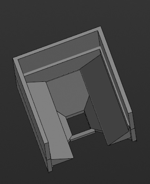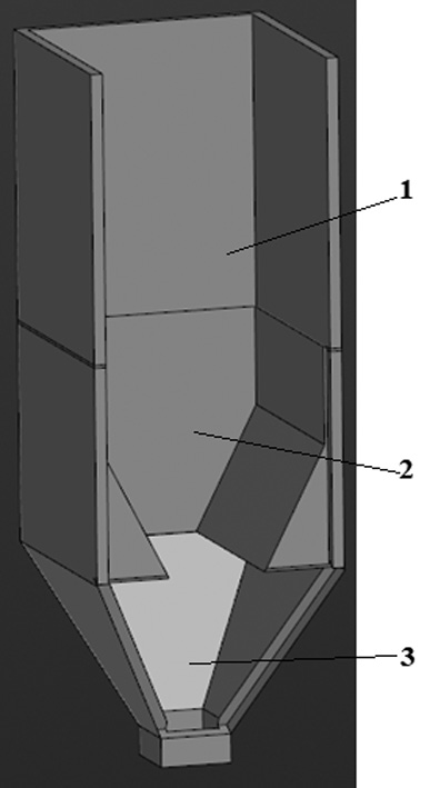 3D-модель поделена на три зоны, которые разделены заслонками между собой (на рисунке не показаны). В случае опустошения нижней зоны 3 задвижки отодвигаются и гранулы пересыпаются из верхних зон 1 и 2 бункера к нижней, а также перемешиваются установленным через все устройство вертикальным шнеком (на модели отсутствует).