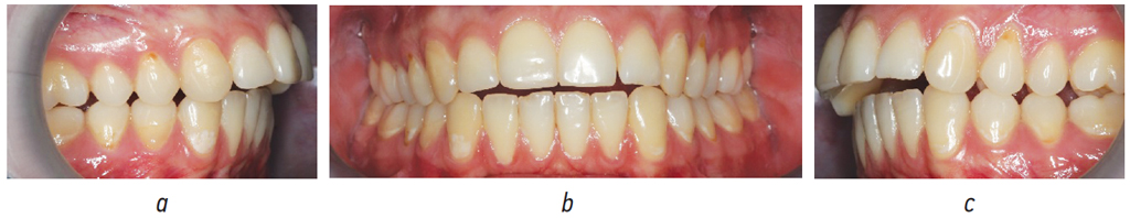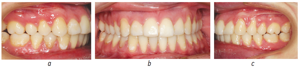 Рис. 1. Зубные ряды пациентки Х. до лечения в боковых (а, b), прямой (c), проекциях