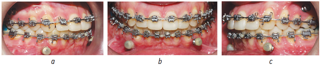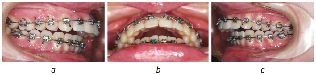 Рис. 5. Зубные ряды пациентки Х. в послеоперационном периоде в боковых (а, b), прямой (c) проекциях: этап создания множественных окклюзионных контактов путем сошлифовывания накладок и применения межчелюстных эластических лигатурных колец