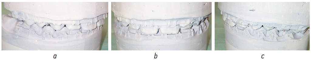 Рис. 3. Гипсовые модели челюстей пациентки Х. в конструктивном прикусе в боковых (а, b), прямой (c) проекциях