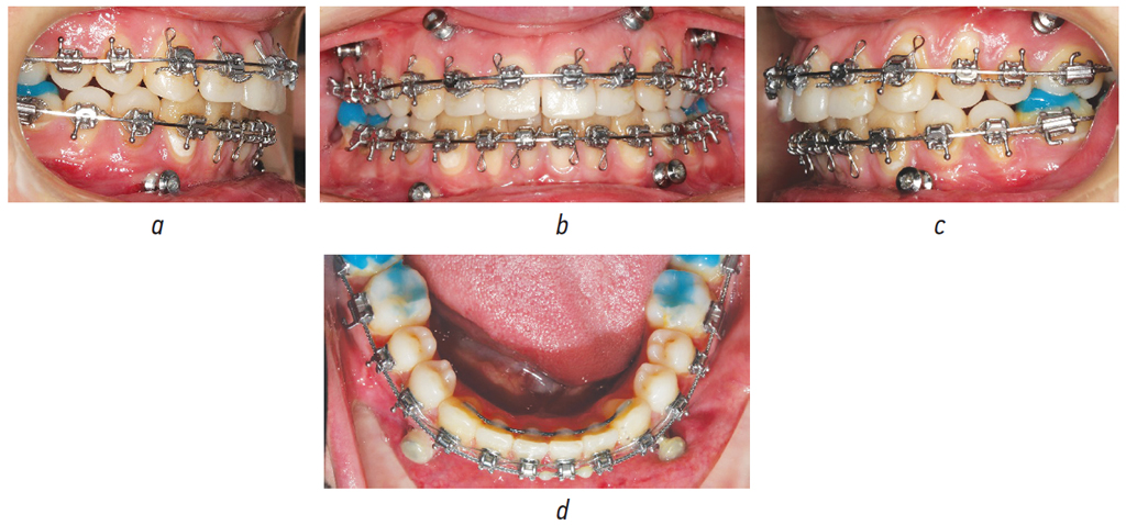 Рис. 4. Зубные ряды пациентки Х. с фиксированными на зубы 3.7, 3.6, 4.6, 4.7 окклюзокорректорами, в послеоперационном периоде в боковых (а, b), прямой (c), окклюзионной (d) проекциях