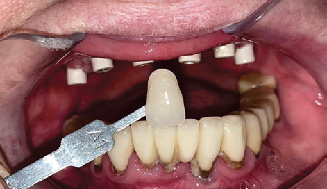 Fig. 8. Protective caps are placed on the multiunit abutments, and the color of the future provisional restoration is determined