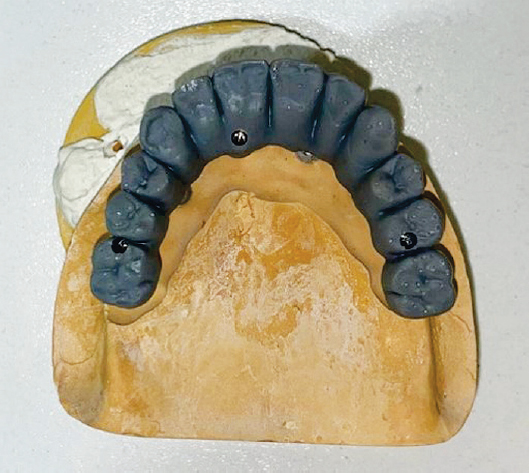 Принято решение для контроля окклюзионных контактов изготовить прототип постоянных коронок из фрезерованной пластмассы, зацементированный на титановой балке (рис. 21, 22).