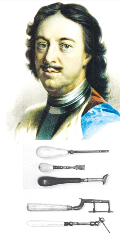 Этот исторический факт подтвержден многими авторами, а сумка с инструментами Петра I хранится в Кунсткамере (рис. 3). Деятельность императора в известной степени оказала влияние на развитие стоматологии в России, поэтому его портрет по праву находится в Музее стоматологии.