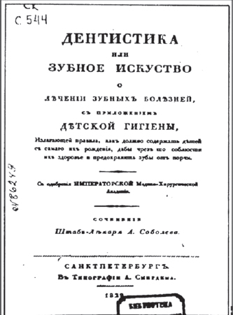 Следует отметить заслуги Алексея Михайловича Соболева, автора изданного в 1829 г. первого отечественного учебника по зубоврачеванию, — «Дентистика, или Зубное искусство о лечении зубных болезней с приложением детской гигиены» (рис. 4). До этого использовались лишь переводные издания. Одним из основных постулатов книги была профилактика.
