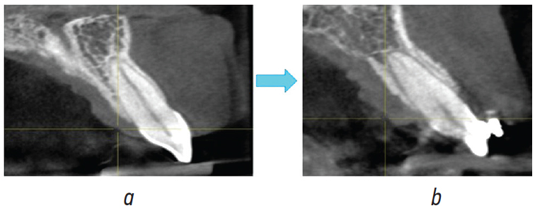 Рис. 3. Рентгенологический контроль до (a) и на этапе (b) ортодонтического лечения