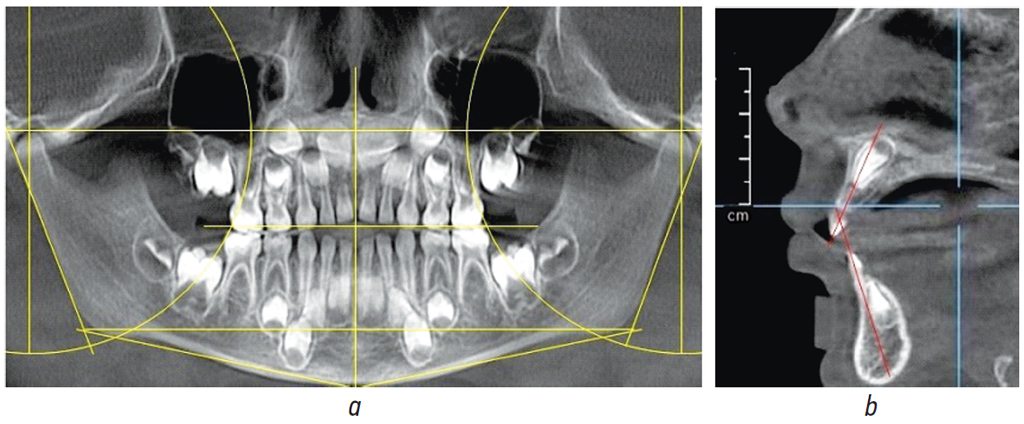 Рис. 2. Анализ расположение ориентиров на ортопантомограмме (а) и томограмме (b)