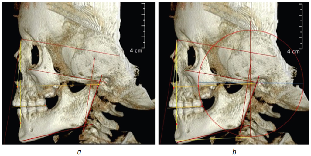 Рис. 3. Анализ трехмерных моделей (а, b) головы ребенка 4 лет в боковой проекции