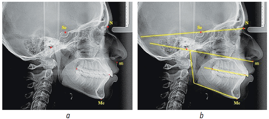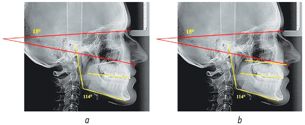 Рис. 3. Особенности расположения линий и углов (а) и сопоставительный анализ камперовской и окклюзионной линий (b) во 2-й группе