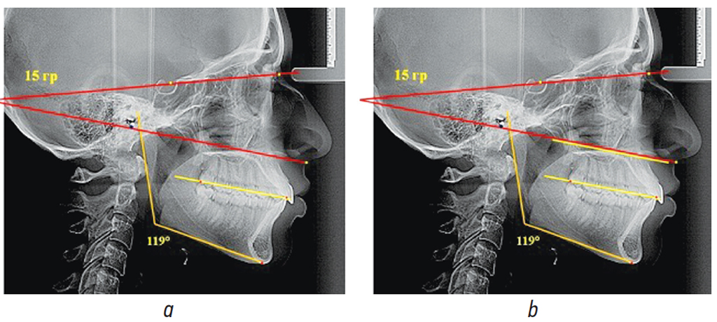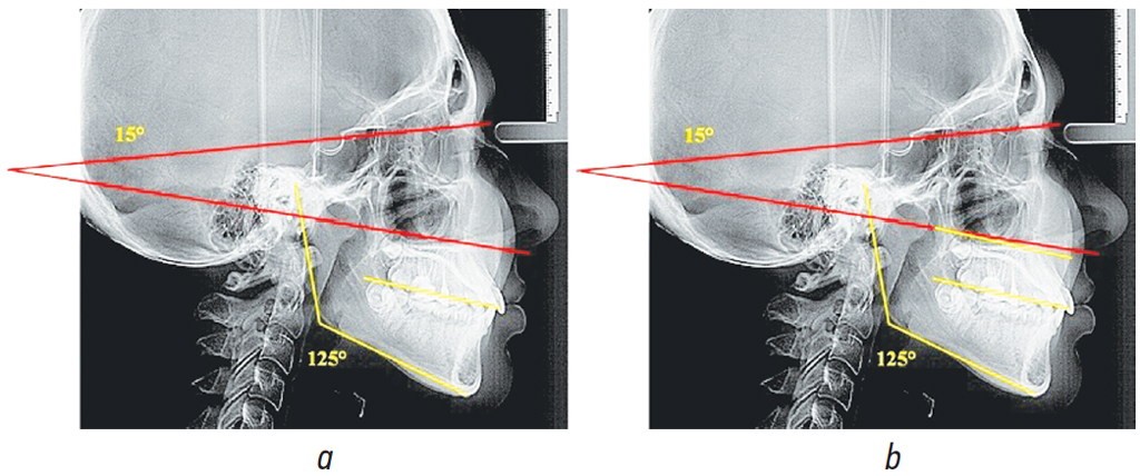 Рис. 2. Особенности расположения линий и углов (а) и сопоставительный анализ камперовской и окклюзионной линий (b) в 1-й группе