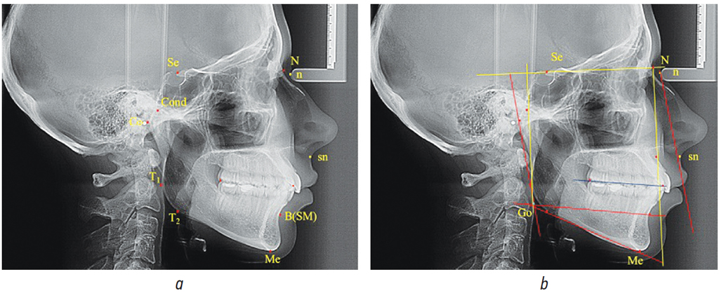 Для анализа боковых телерентгенограмм врач-ортодонт использует общепринятые точки, после соединения которых, измеряются линейные размеры в сагиттальном, вертикальном и диагональном направлениях [11, 12].