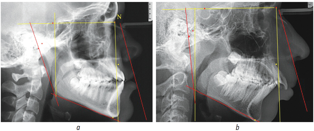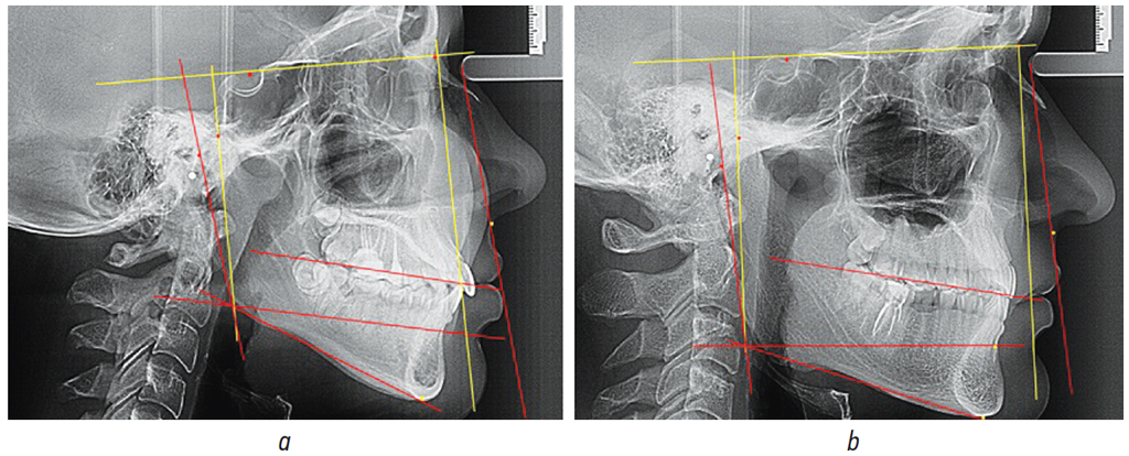 В исследуемой группе угол, образованный назальной вертикалью лица и окклюзионной плоскостью, составлял 81,85° ± 2,09°, с мандибулярной плоскостью — 66,65° ± 1,43°, а с линией В-Go — 84,78° ± 2,14°.
