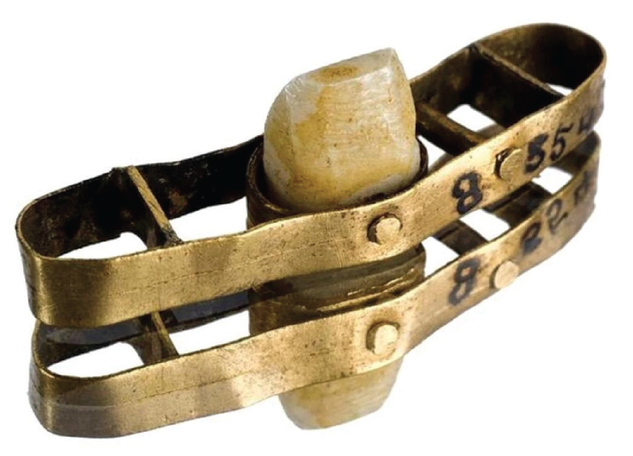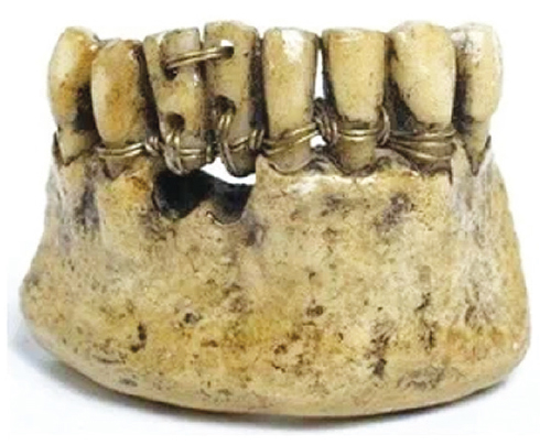 В Египте стоматологи умели заменять выпавшие зубы искусственными, обрабатывать кариозные полости. При изготовлении протезных конструкций применяли золотую проволоку для фиксации выпавших зубов к имеющимся [1, 6] (рис. 1). При этом могли быть использованы зубы как самого больного, так и его рабов или павших в сражении воинов [5]. Редко искусственные зубы вытачивали из древесины твердых пород.