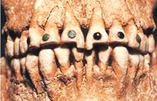 Стоматология древних майя была очень высоко развитой. Услугами зубного врачевателя пользовались и правители, и обычные жители вне зависимости от финансового состояния. Зубы древних майя были гордостью их владельцев: они часто украшали зубы драгоценными камнями, нефритом, агатом, бирюзой, гематитом, а также золотом, иногда даже в раннем возрасте [1] (рис. 2). Такое украшение зубов служило не только для эстетических, но и для духовных целей.