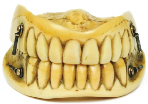Fig. 5. Whole piece full dentures skillfully made of ivory, secured with springs and completely covering the hard palate. Source: https://mirfactov.com/stomatologi-proshlogo/