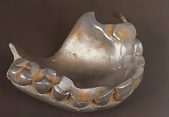 Рис. 6. Частичный съемный протез для нижней челюсти на основе благородного сплава с зафиксированными искусственными зубами. 1861 г. Источник: https://stomatologclub.ru/galereya/muzej-stomatologii-3/chastichno-semnyj-zubnoj-protez-1860g-postroennyj-iz-metalla-i-vulkanita-2085/