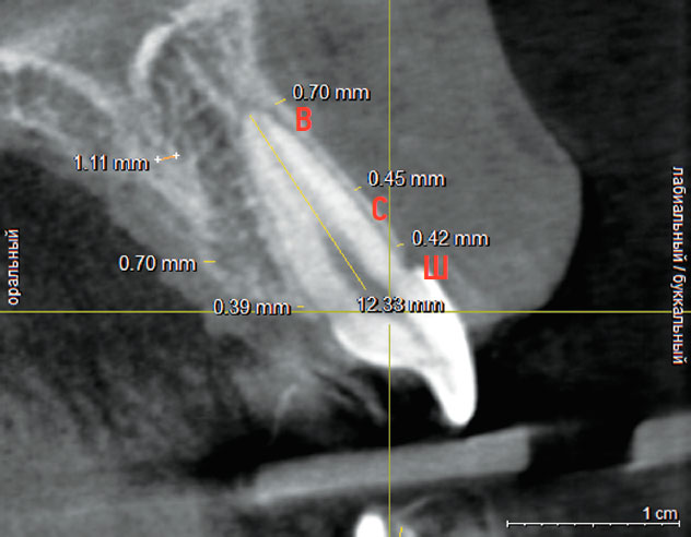 Рис. 1. Измерение длины корня зуба 1.1 на сагиттальном срезе, измерение толщины компактной пластинки с вестибулярной стороны в 3 областях: В — верхушка корня, С — средняя часть корня, Ш — шейка