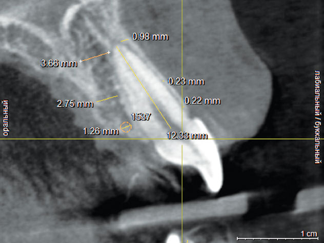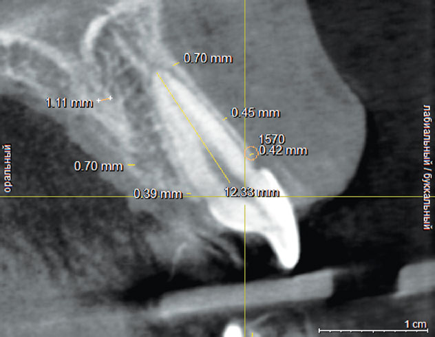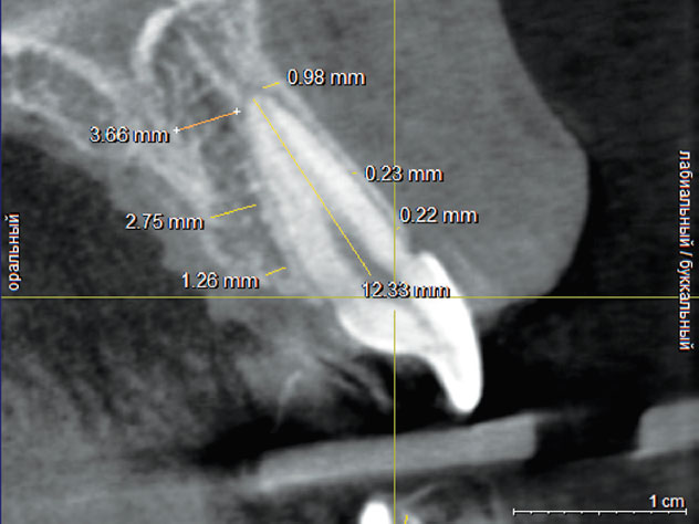 Рис. 3. Измерение толщины губчатой кости с нёбной стороны зуба 1.1
