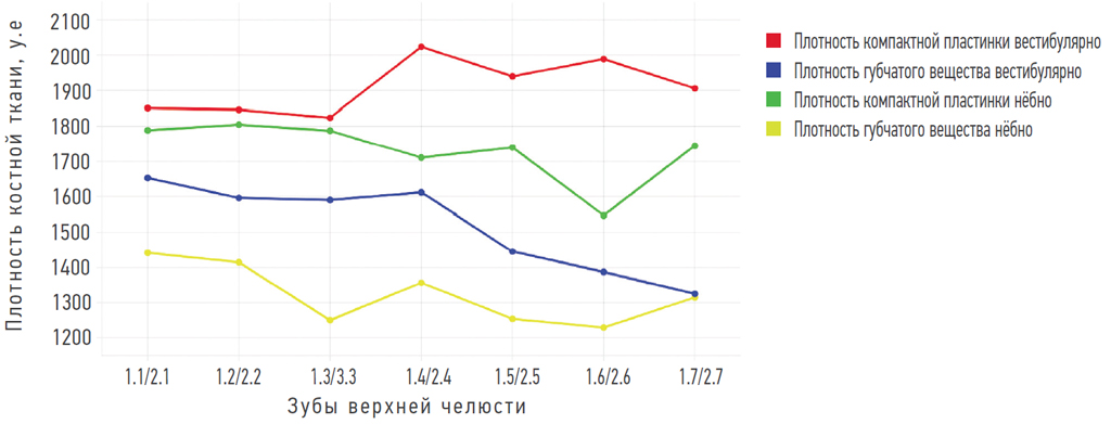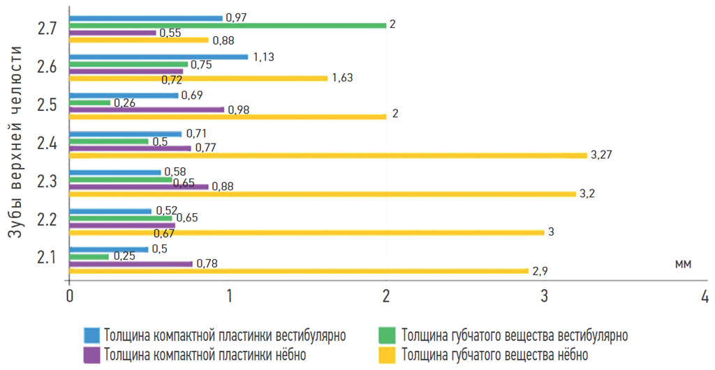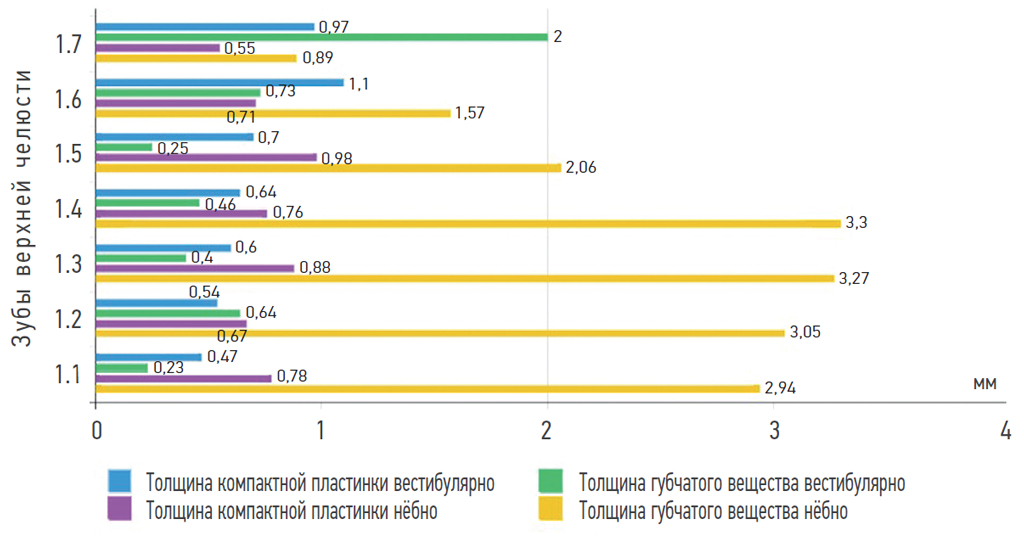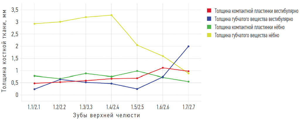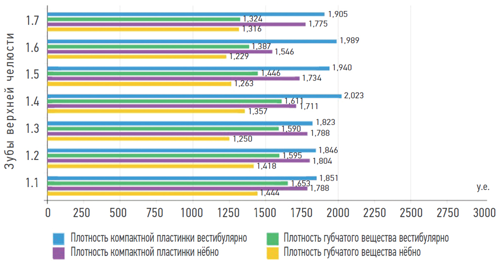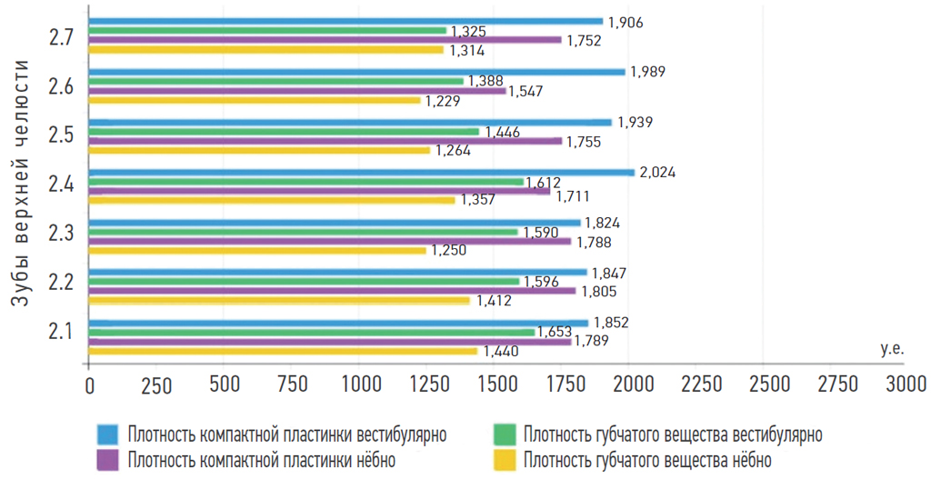 Выявлено, что минимальная толщина губчатой кости располагалась с вестибулярной стороны в 1-м сегменте и составила 0,23 ± 0,15 мм, во 2-м сегменте 0,25 ± 0,17 мм. Максимальная толщина губчатой кости с нёбной стороны составила в 1-м сегменте 3,3 ± 1,5 мм, во 2-м сегменте 3,27 ± 1,47 мм. Минимальная плотность губчатой кости с нёбной стороны составила в 1-м сегменте 1250 ± 125 у.е., во 2-м сегменте 1250 ± 125 у.е. Максимальная плотность компактной пластинки с вестибулярной стороны составила в 1-м сегменте 2023 ± 245 у.е., во 2-м сегменте 2024 ± 246 у.е.