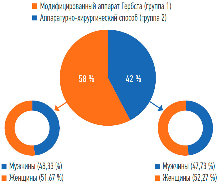 Цель исследования — сравнить результаты лечения скелетных форм дистального соотношения зубных рядов у взрослых пациентов с использованием модифицированного аппарата Гербста и аппаратурно-хирургическим способом.