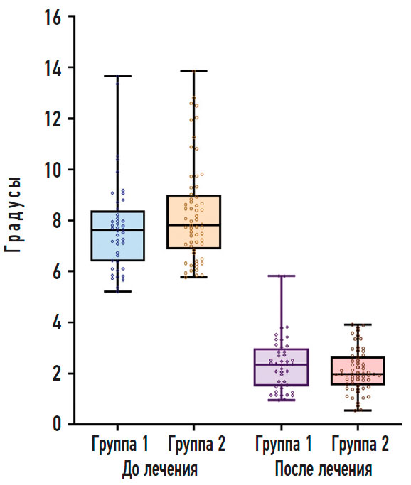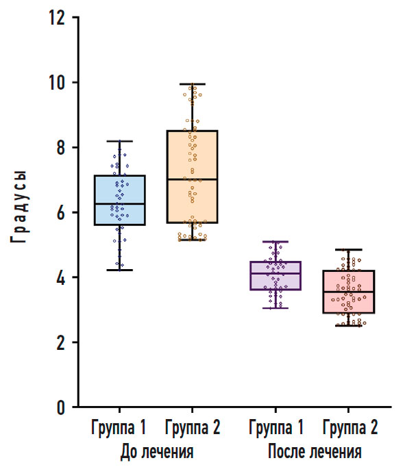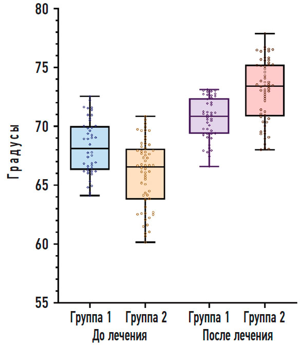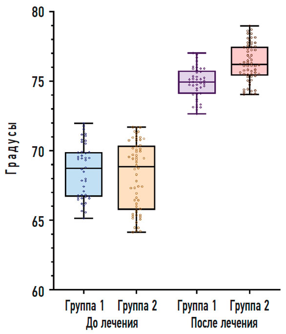 При анализе параметра s-n-pg в группе 1 значения до и после лечения составили 68,12 ± 2,34°и 70,84 ± 2,07° соответственно. При анализе этого параметра в группе 2 значения до и после лечения составили 66,69 ± 2,73° и 73,41 ± 2,38° соответственно.