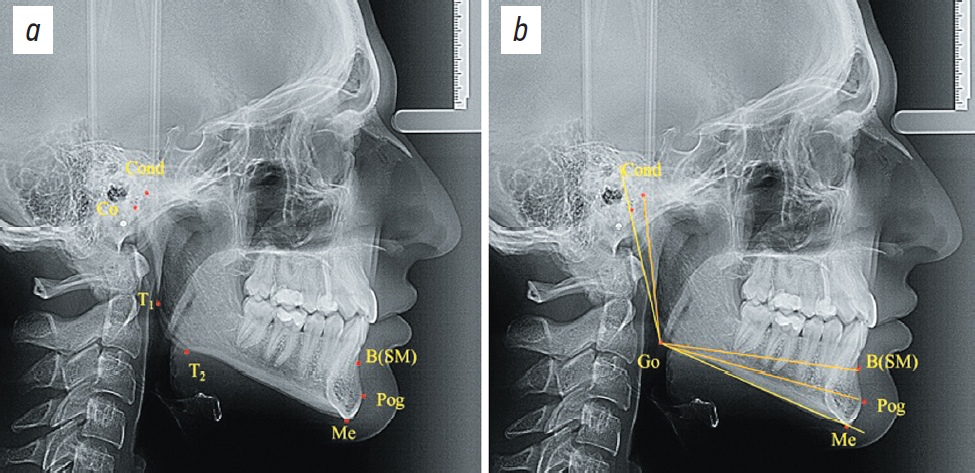 На фотографии телерентгенограмм наносили точки, применяемые в клинической практике ортодонтии. На суставном отростке нижней челюсти в верхней его точке ставили точку кондилион (Сond) а наиболее выпуклую точку задней его поверхности обозначали как Со. В области угла нижней челюсти на задней выпуклости ветви ставили точку Т1, а на нижней выпуклости угла на теле челюсти ставили точку Т2. Нижняя точка подбородка (Ме) при соединении с точкой Т2 определяла положение мандибулярной линии. Выпуклости ветви позволяли провести к ней касательную линию Со-Т1. Место соединения проведенных касательных линий — конструктивная точка гонион (Go), служившая отправным ориентиром для измерения высоты ветви (Gо-Сond) и длины тела нижней челюсти. Длину тела измеряли между разными ориентирами, в частности до точки ментос (Gо-Ме), до наиболее выступающей точки подбородка погонион (Gо-Pog) и до cупраментальной точки Downs (Gо-B(SM)) (рис. 1).