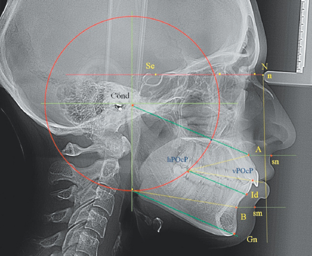Fig. 1. Construction of the occlusal–condylar circle and diagnostic lines on a lateral cephalometric radiograph.